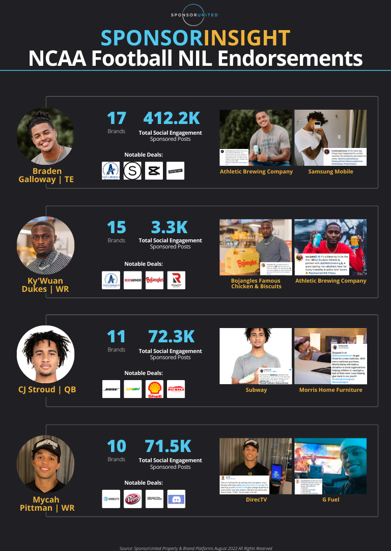 We highlight collegiate football athletes this year who have already amassed a large NIL endorsement portfolio.