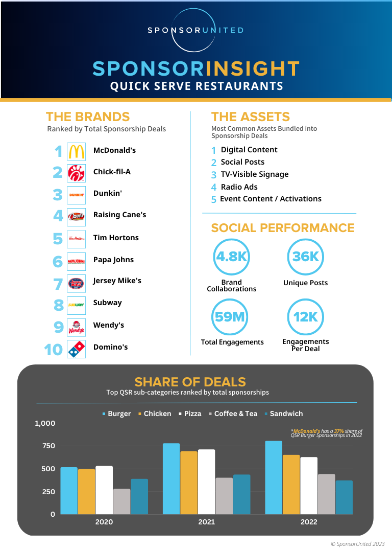 - QSR Chicken surpassed QSR Pizza in total sponsorships in 2022.