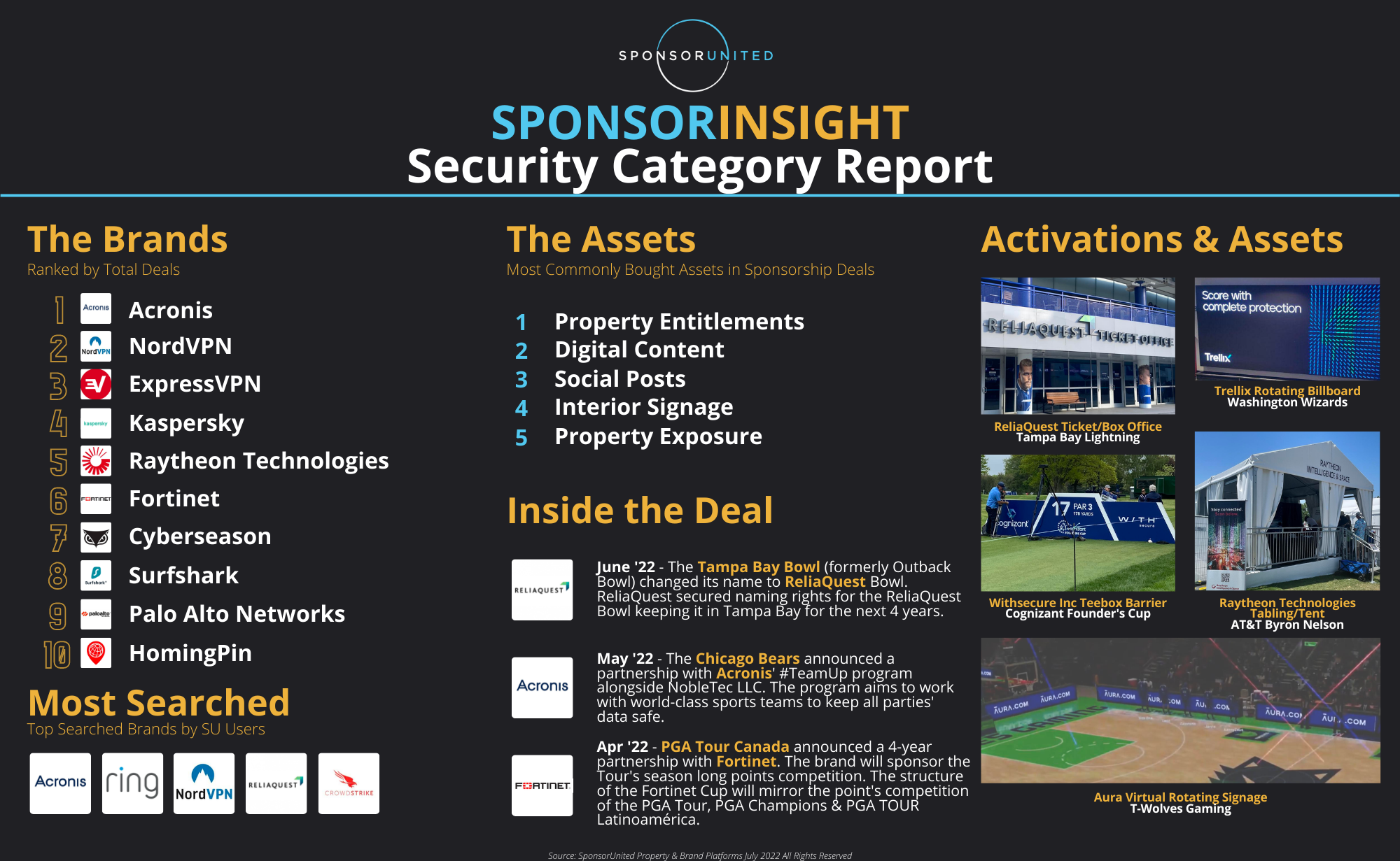 And given that the number of active brands in the category has more than doubled over the last two years, IT Security’s momentum shows no signs of stopping. With more than 10 new sponsorship deals each in 2022, Acronis, NordVPN, ExpressVPN, Kaspersky, and Raytheon Technologies top the list of the fastest-growing brands.