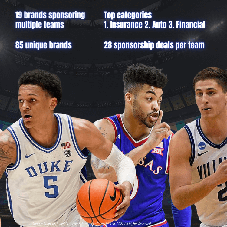 State Farm, Nissan, GEICO, and Continental Tire are still alive in the Final Four. These four brands have a sponsorship deal with all of the remaining teams.